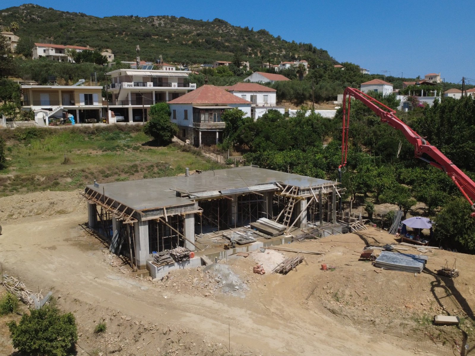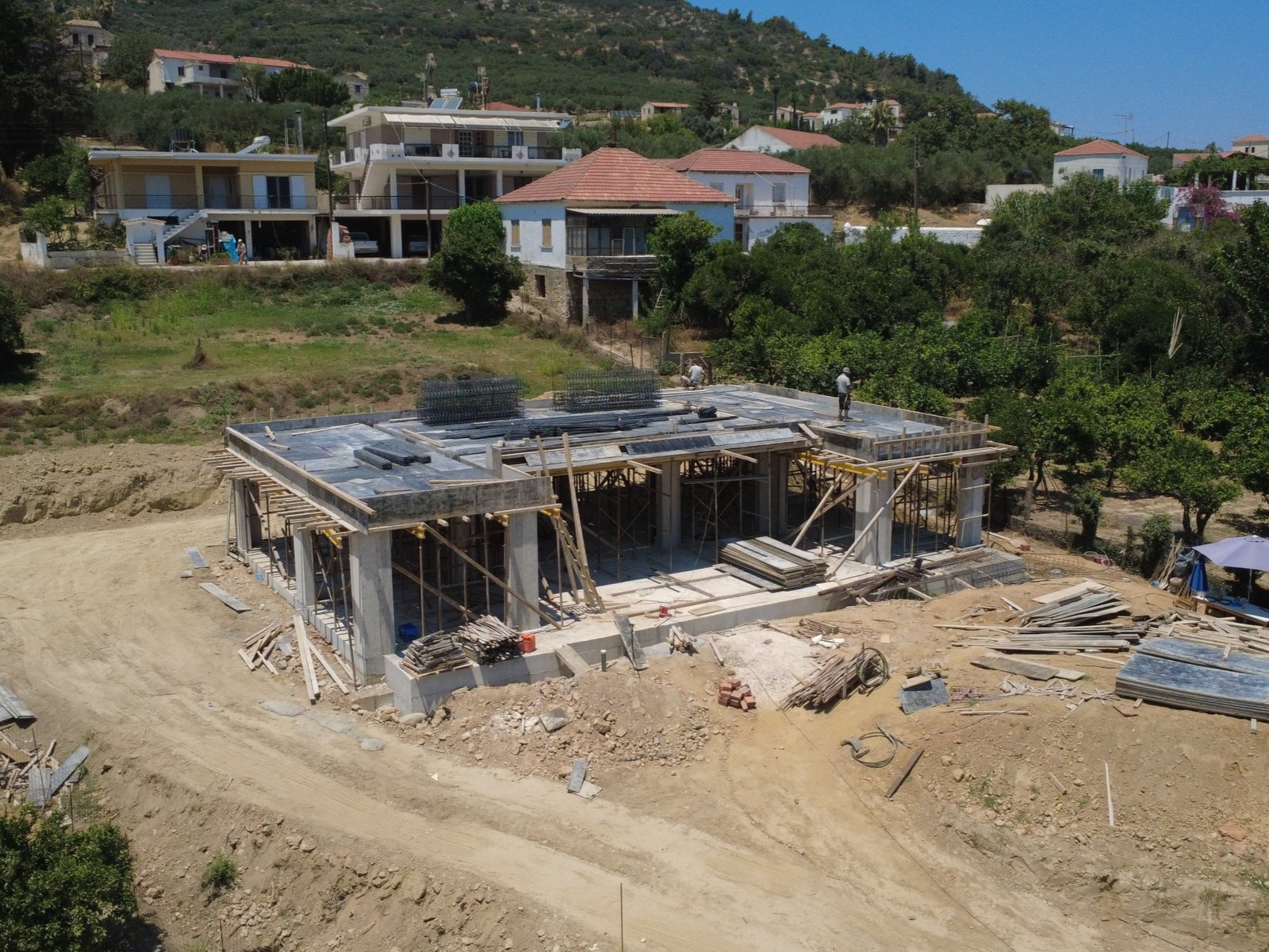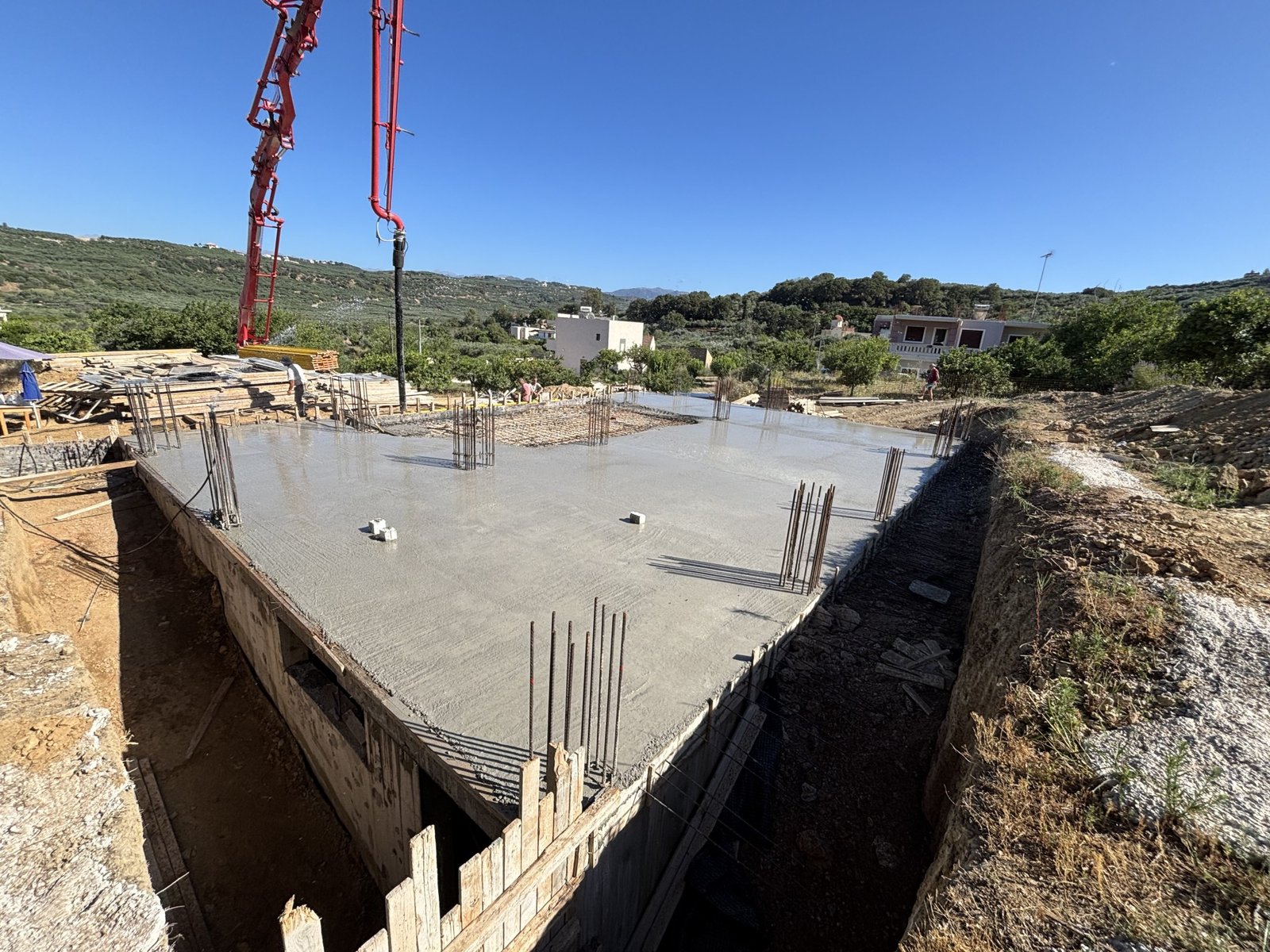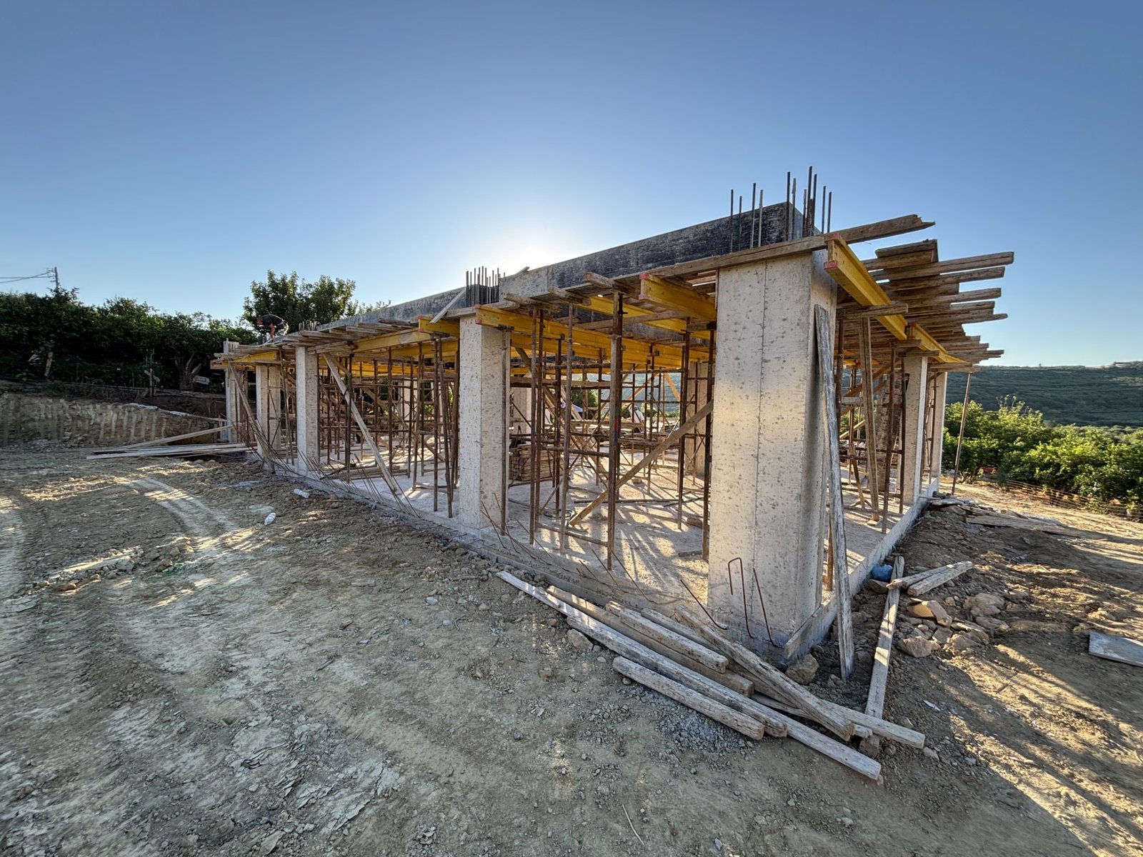 Discover a residential project currently under construction in the tranquil area of Spilia. The accompanying 3D model offers a detailed look at the villa’s final design and layout and the image carousel provides an ongoing visual record of the construction phases, illustrating the process and the materials being utilized to bring this design to the final state.